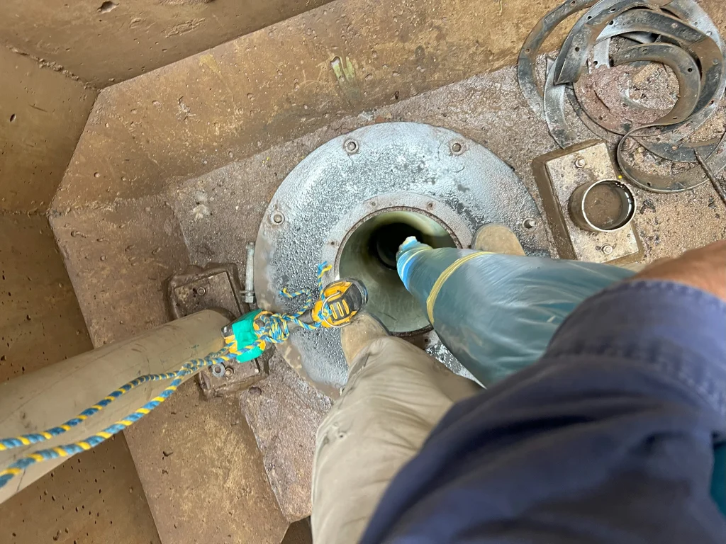 For the relining process itself, the team employed a strategic liner insertion method. Instead of relining from end to end, they inserted the liner at an access point above the bend and halfway down the bottom pipe. This approach allowed for easier manipulation and installation of the liner. For the vertical sections, the liner was suspended and inflated in place for curing, adapting their techniques to the unique demands of the project.