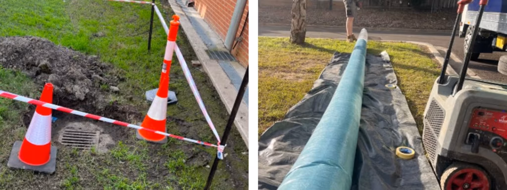The rehabilitation works successfully restored the stormwater system servicing the rear of C Block at the High School. The 225mm PVC line, previously compromised by tree root intrusions, failed joints, and heavy silt build-up, was structurally reinforced through Blueline relining. The use of Ready Cure technology enabled the liners to be cured and the line returned to service within a single day, significantly reducing downtime and disruption to school operations. Excavated pits were reinstated and prepared for long-term accessibility, while robotic cutting ensured that critical junctions remained open and fully functional. Final CCTV inspections confirmed that the system is now clear, watertight, and performing as designed, with capacity restored and future intrusion risks minimised. The site was left safe, operational, and better prepared for future storm events, ensuring a reliable and long-term solution for the school community.